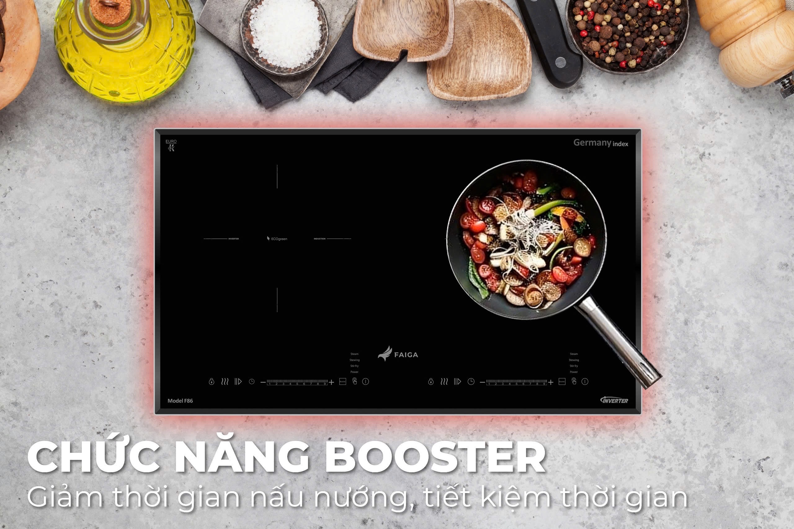- Chức năng BOOSTER với chức năng này bếp sẽ sở hữu khả năng vận hành của bếp trong thời gian ngắn. Giảm đến 50% nấu ăn .