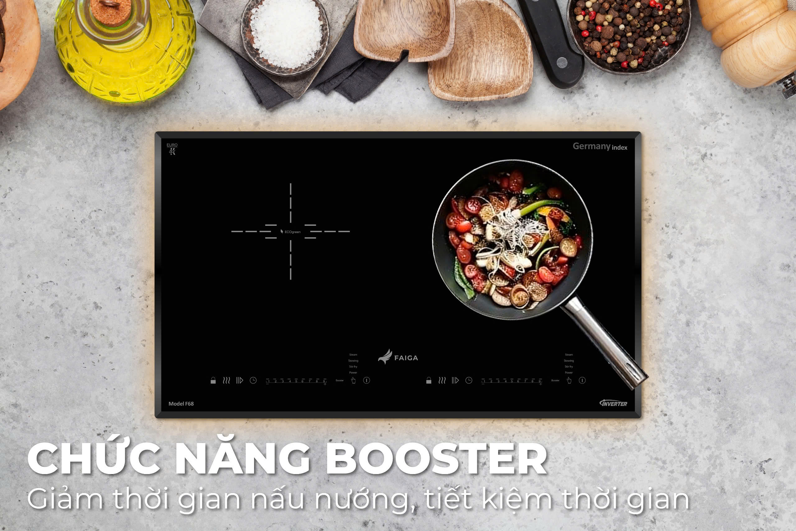- Chức năng BOOSTER với chức năng này bếp sẽ sở hữu khả năng vận hành của bếp trong thời gian ngắn. Giảm đến 50% nấu ăn .