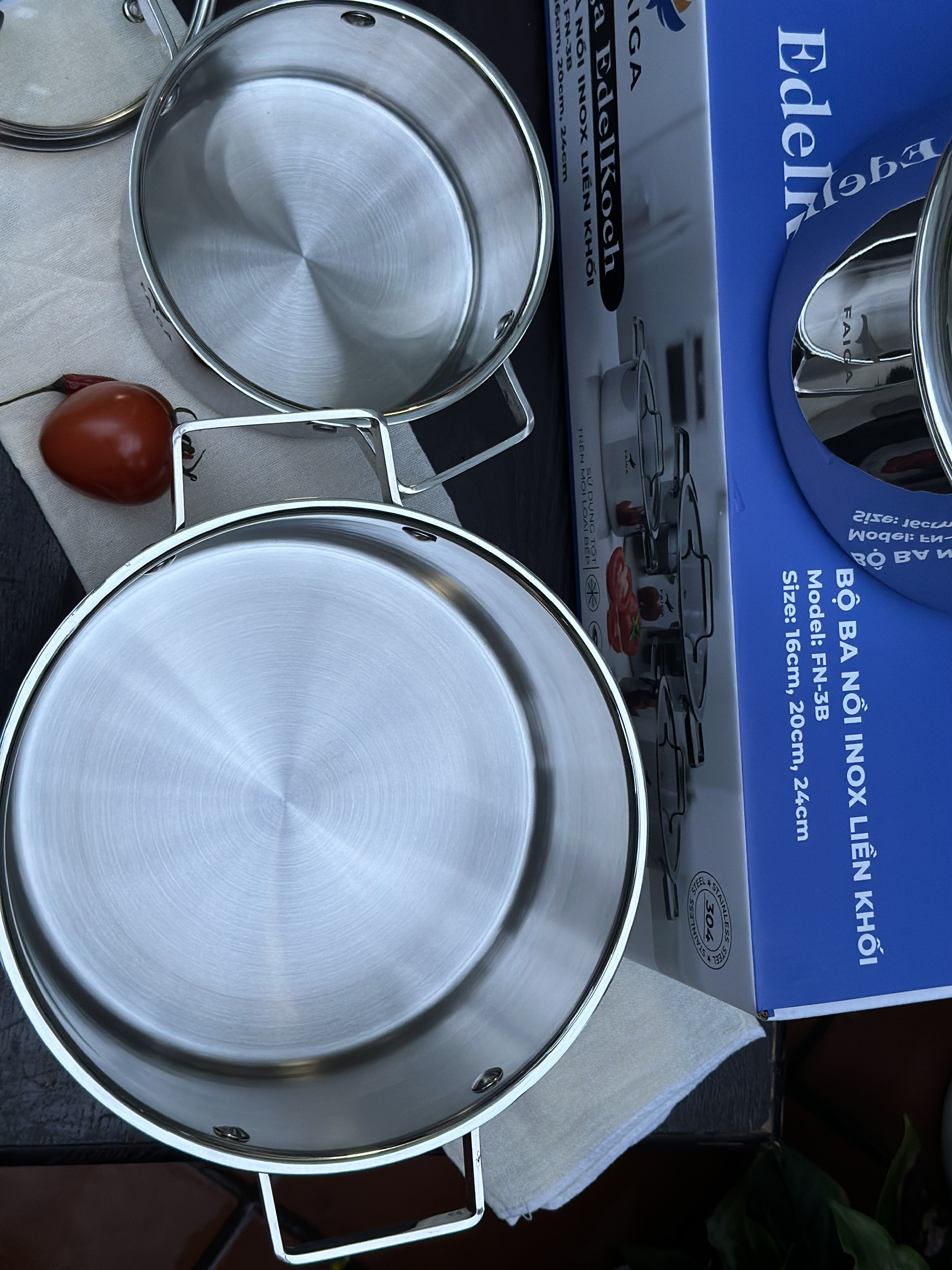 ”- Bộ 3 nồi inox đúc nguyên khối gồm: size 16,20,24 cm.