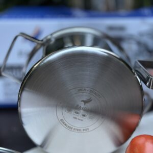 ”-Thân nồi đúc liền nguyên khối gồm 3 lớp: inox 304,lớp nhôm và lớp inox 430 bắt từ.
